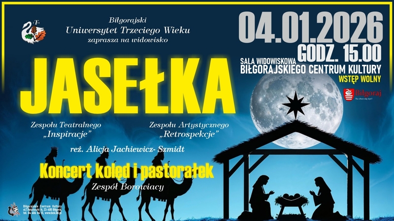 Jasełka i koncert kolęd![]() Gdzie: Biłgoraj, BCK Kiedy: 2026.01.04, godzina 15:00 Opis: Uniwersytet Trzeciego Wieku zaprasza mieszkańców na pełne świątecznego klimatu wydarzenie, podczas spotkania publiczność obejrzy widowisko "Jasełka", przygotowane przez zespół teatralny "Inspiracje" oraz zespół artystyczny "Retrospekcje". Reżyserią przedstawienia zajęła się Alicja Jachiewicz-Szmidt. ![]() REKLAMA